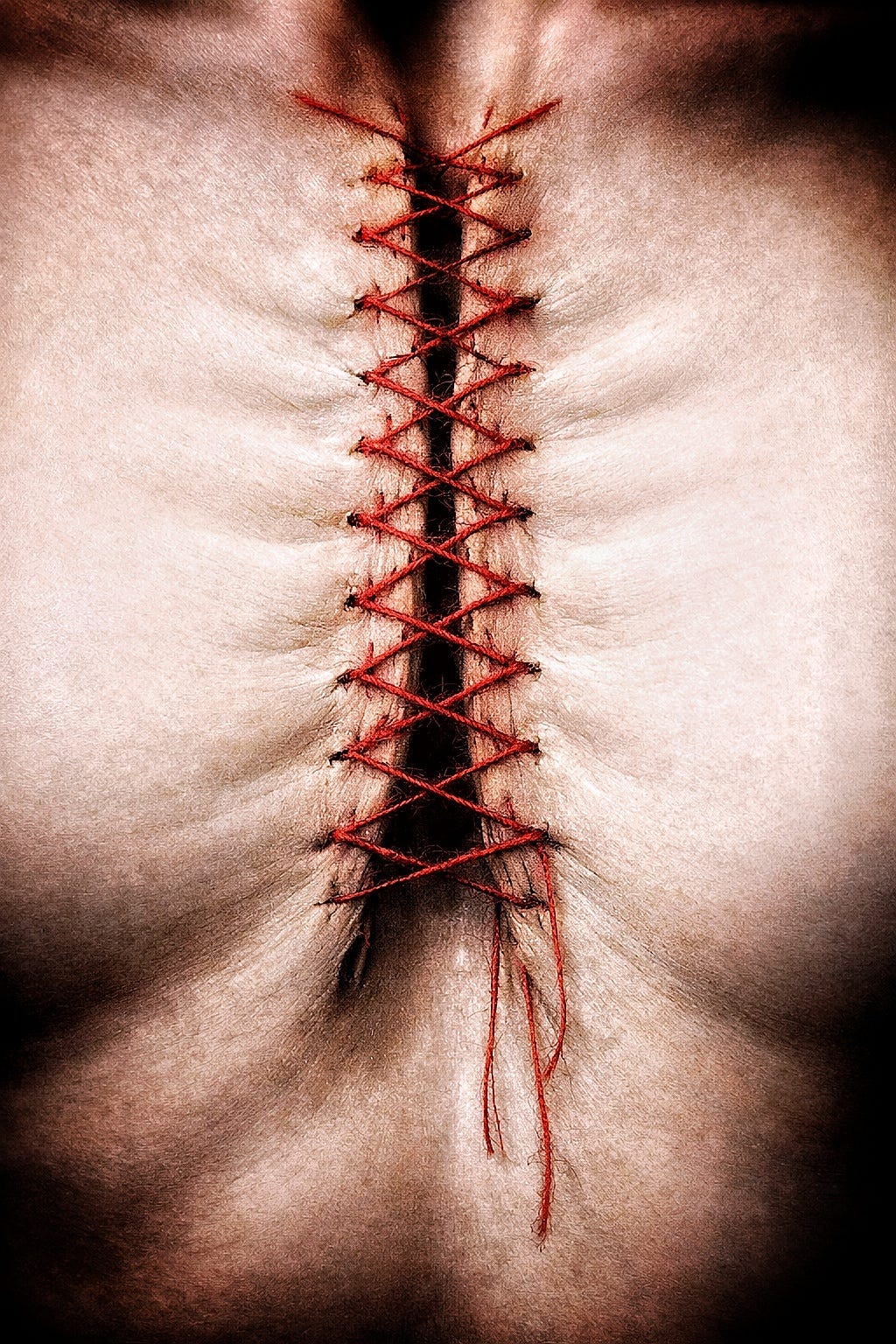 Red threads stitch down the shared ribs, tugged tight, then tighter.